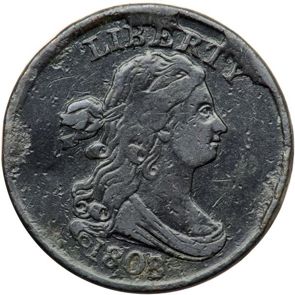 1808/7 C-2 Overdate 8 over 7 VG7. Sharpness F15 or so but dark with small areas of roughness at the rim on the right and left sides of the obverse. There are some contact marks scattered about both sides, plus a deep punchmark on the leaf below E in UNITED and a scrape on the rim at RI in AMERICA. Glossy very dark olive and steel brown, nearly black. Not the most attractive half cent in this sale, but the die state makes up for at least part of the deficiency. Extremely rare LDS, Manley state 6.0, with strong cud breaks at BE and TY in LIBERTY. Only 3 examples of this state are known (all relatively ugly) and two of those are offered in this sale. The piece offered here is arguably the finest of the three. Davy #08.2.8.