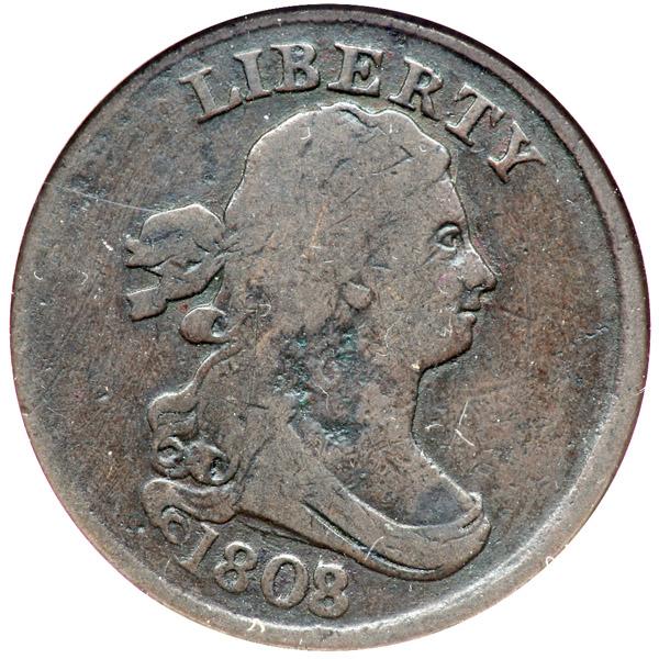 1808/7 C-2 R3 Overdate 8 over 7 ANACS graded VG10 details corroded. Glossy olive brown and chocolate fading to darker olive in protected areas. The surfaces are smooth and attractive except for a patch of shallow roughness high on the neck and a shallow pitmark at the dentils left of the fraction. The date and legends are strong and the overdate feature is obvious. EDS, Manley state 1.0, prior to any die cracks on the obverse. Our grade is net G6. The attribution is noted on the ANACS label.