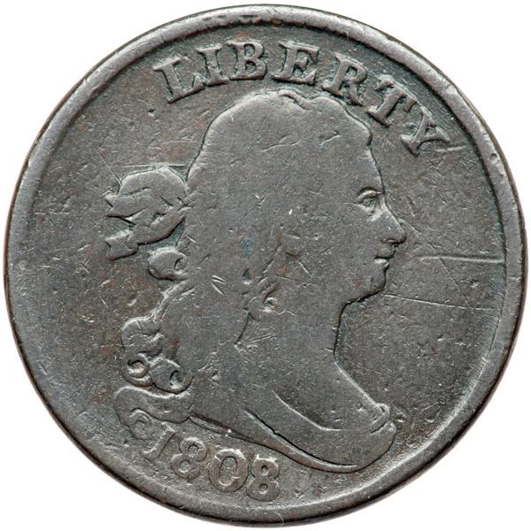 1808/7 C-2 R3 Overdate 8 over 7 G6. Glossy dark olive brown and chocolate. No roughness or verdigris. The only defects are a couple fine, old scratches in the field before the face and another under CEN. These scratches blend perfectly into the natural toning and are not distracting. The date and legends are complete and strong, and the overdate is obvious. EDS, Manley state 1.0, prior to any die cracks on the obverse.