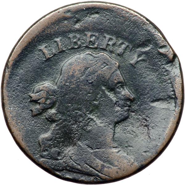 1808 C-3 R1 AG3. Off Center Obverse Brockage. Sharpness VG8 or so but there are several dull dents on the obverse and the surfaces are covered with fine roughness under the rather glossy dark olive brown and chocolate patina. The highpoints are a lighter shade of chocolate brown. Struck 20% off center to K-7. The obverse was struck by the die while the reverse was pressed into the obverse of an already struck coin that remained in the press, thereby creating an off center obverse brockage on the reverse of this piece. The normal and incuse designs are off center by the same degree but are rotated slightly so the images do not line up perfectly. Only the very top of the date digits made it onto the planchet, the top of the second 8 clearest since it is positioned so high relative to the other 3 digits. A very rare type of error for this date. Davy #08.3.15.