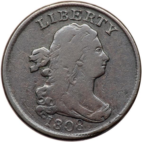1808 C-3 R1 F12. Double Struck over Off Center Obverse Brockage. Glossy chocolate and light olive brown. Smooth and attractive for the grade. Free of any hint of corrosion or verdigris with only minor contact marks, none notable. E-MDS, Manley state 2.0. The reverse is rotated 50 degrees CCW relative to a normal head-to-foot die orientation. Double struck. The first strike was a 10-15% off center obverse brockage. The second strike was normal and centered on the planchet with the obverse struck over the incuse brockage impression from the initial strike. The incuse RTY from LIBERTY is clearly visible at the bust tip of the second strike, and obvious undertype of the head from the off center normal obverse of the first strike shows on the upper right part of the reverse. A clean, attractive example of this type of mint error. Davy #08.3.32.