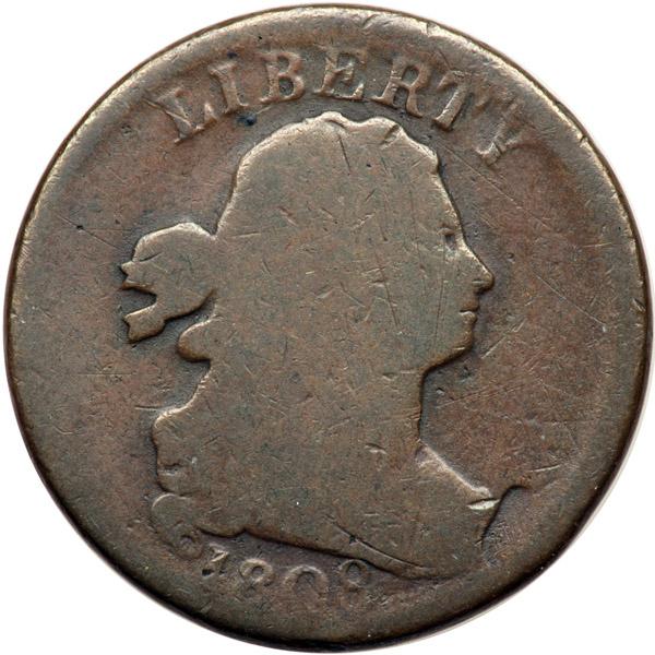 1808 C-3 R1 G5. Double Struck over Off Center Uniface Obverse. Glossy light chocolate and steel brown with darker chocolate toning in protected areas. The surfaces are smooth and attractive but a glass reveals old hairline scratches hidden in the toning on the right side of the obverse. LDS. Double struck. The first strike was well off center and the neck of Ms Liberty from this impression is clearly visible at the tip of the bust of the centered second strike. The reverse shows a strongly impressed arc from a blank planchet at the top of the wreath, and it appears this impression was made before the second strike occurred. The off center obverse strike does not line up with the impressed arc, so things were getting quite jammed up in the coining chamber. Davy #08.3.26.