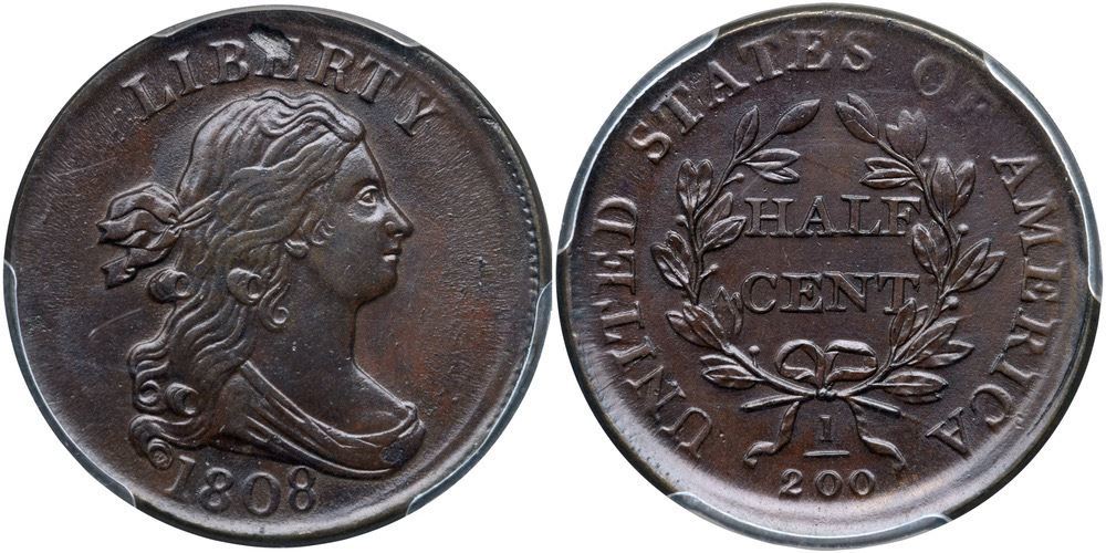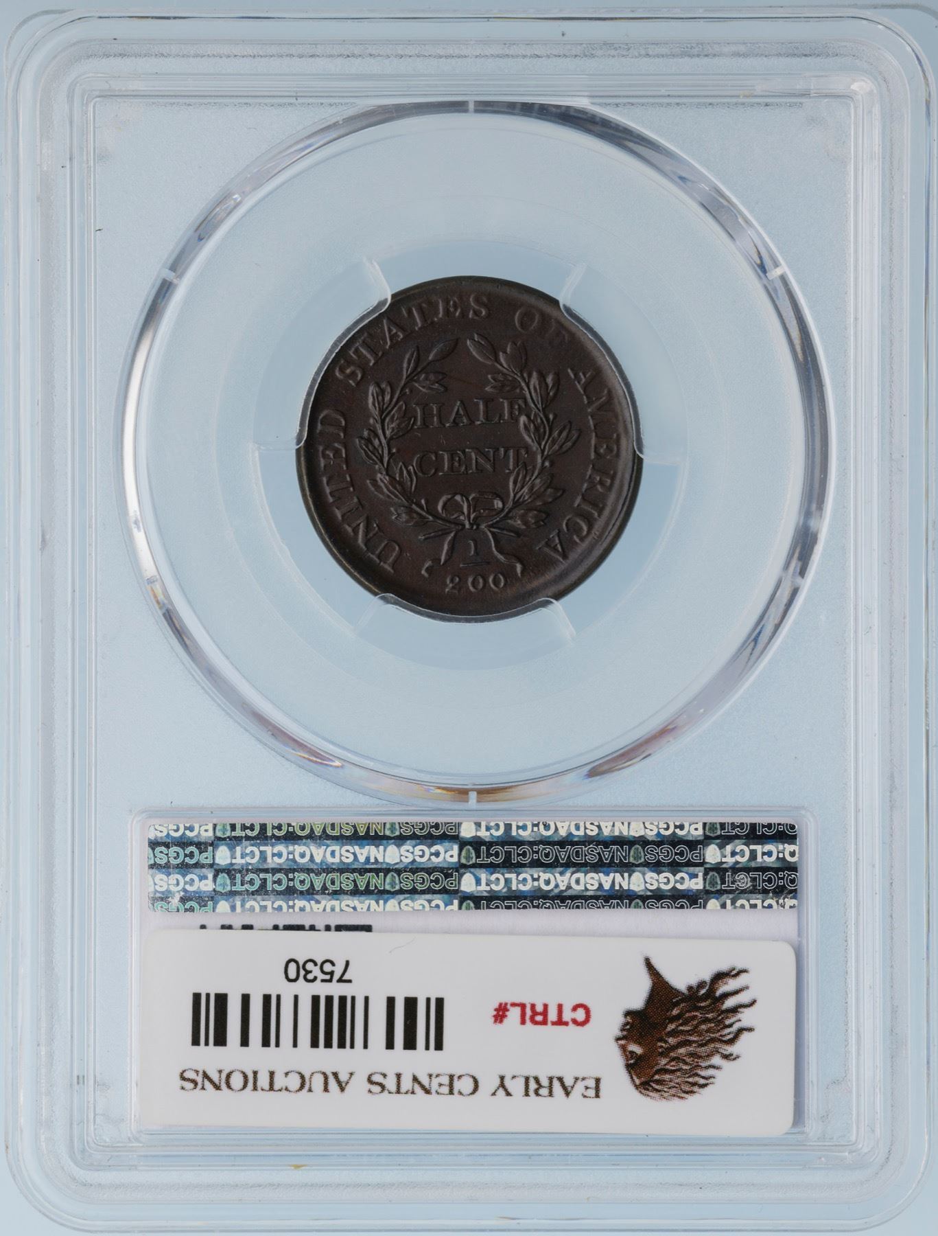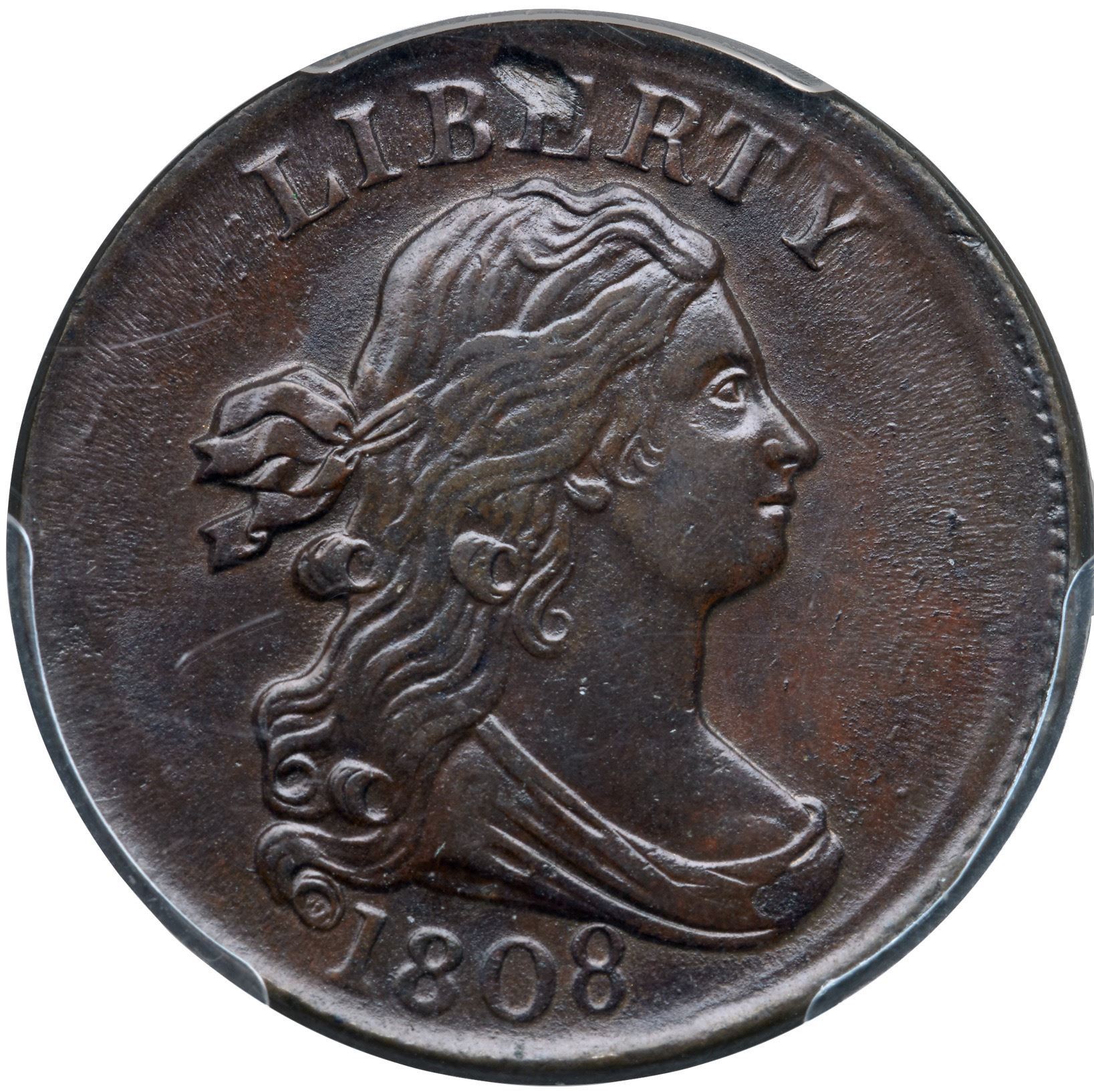 Glossy chocolate brown and steel. Satiny luster covers the planchet and it shows no trace of friction on the highest points of the devices. However, there is a mint-made planchet flake at the top of the E in LIBERTY, and it is obvious to the unaided eye. Otherwise the only mark is a barely visible spot of planchet impurity hidden in the drapery folds at the bust tip. M-LDS, Manley state 4.0, with a die crack from the rim through the I in UNITED to the leaves below. Only traces of dentils remain visible on both sides and the reverse is rotated 15 degrees CCW. Our grade is AU55. The attribution and Green Tree Collection provenance are noted on the PCGS label.