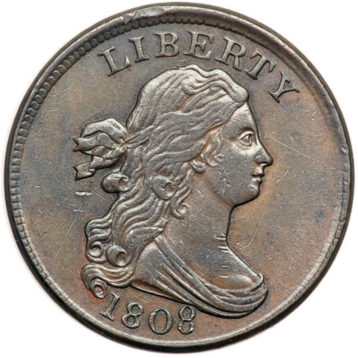 1808 C-3 R1 VF35. Rotated Reverse. Ten points sharper with a light vertical scratch down the neck and another from the hair ribbon into the field left of the lower curls where it fades away, plus a dull mark on the rim above IB in LIBERTY. Glossy steel and olive brown with frosty lighter steel brown toning in protected areas, especially on the obverse. Nicely struck E-MDS, Manley state 2.0. The dentils are crisp where struck up, the repunching on the second 8 is sharp, and the reverse is rotated 165 degrees CW relative to the normal head-to-foot die orientation.