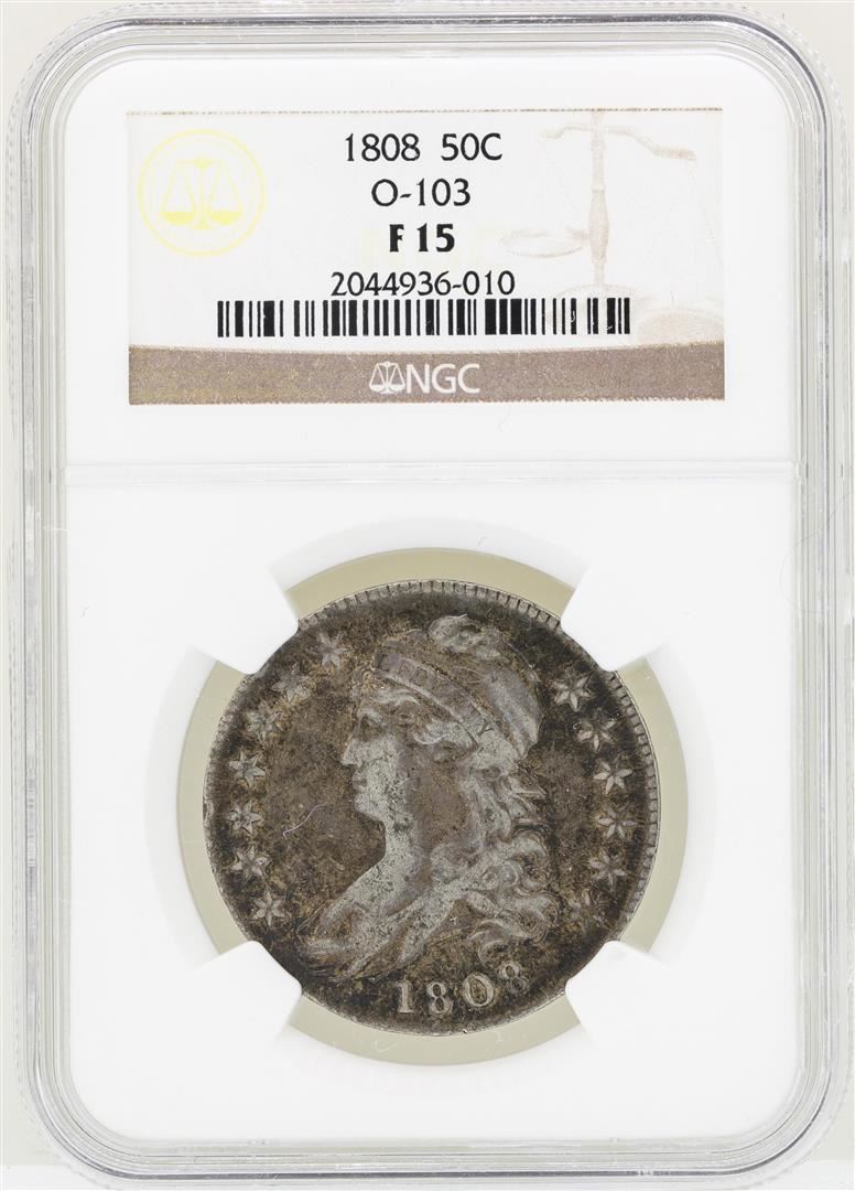 One 1808 Capped Bust Half Dollar Coin O-103 NGC F15. NGC Certified.