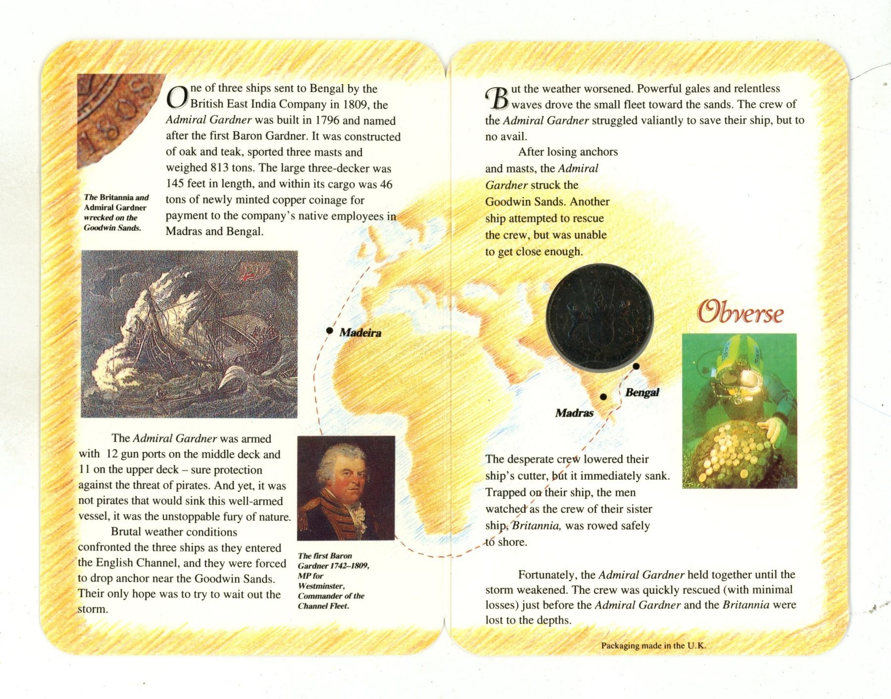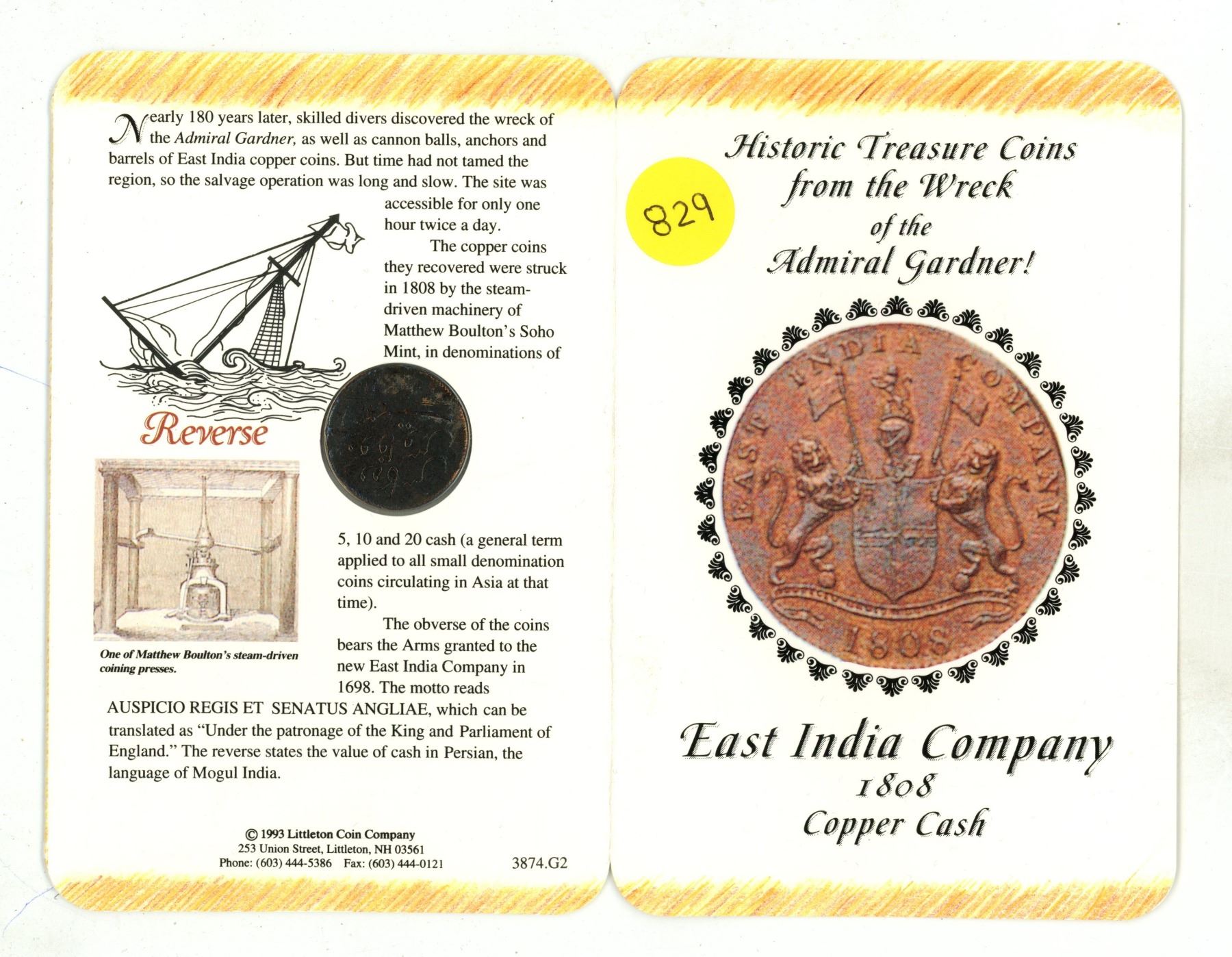 1808 Copper Cash coin issued by the East India Company. A Treasure coin from the Wreck of the Admiral Gardner, which sank in 1809 in the English Channel. Housed in a folder that tells the story of this famous ship and its valuable cargo.