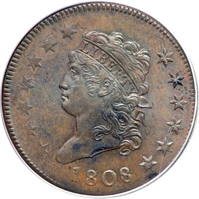 1808 S-278 R3. PCGS graded MS-62 Brown. Turban Head. Lustrous light chocolate and steel brown with hints of faded mint color peeking through in a couple of the protected areas on both sides. Frosty and very attractive, the satiny mint luster covering the fields and most of the devices. EDS, Breen state I, with die guide lines visible between S-O and F-A. The obverse is slightly misaligned to K-5, which is typical of the early die state of this variety. The misalignment caused weakness along the left edge of both sides leaving stars 1-6 and NITED ST weakly impressed while the remainder of the details are nicely impressed. A beautiful Turban Head cent in spite of the imperfect strike. Called AU55 and tied for CC#10 in the Noyes census, his photo #60001. Our grade is AU58+, very close to MS60. The attribution and Husak provenance are noted on the PCGS label.