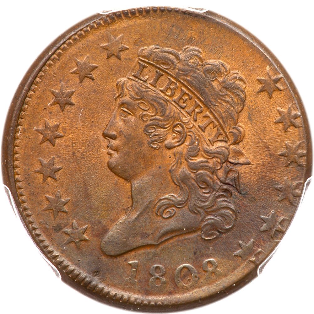 1808 S-278 R3 PCGS graded MS63 Brown. Frosty golden tan and steel brown blending to reddish olive at stars 11-13. The surfaces are lustrous and the only notable marks are a shallow planchet flake near the dentils below the bust tip and a collection of tiny nicks or scratches at the top of the head into the field above. Later die state with flowlined fields but no rim cud breaks on the obverse.  Our grade is net AU55.  PCGS population 12; 7 finer: 1 in 64, 2 in 65, 4 in 66. PCGS #1543.  Estimated Value 7,500 - UP