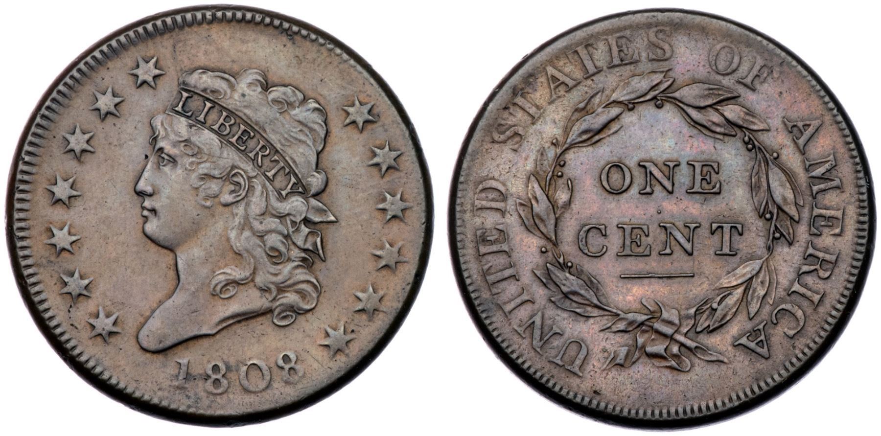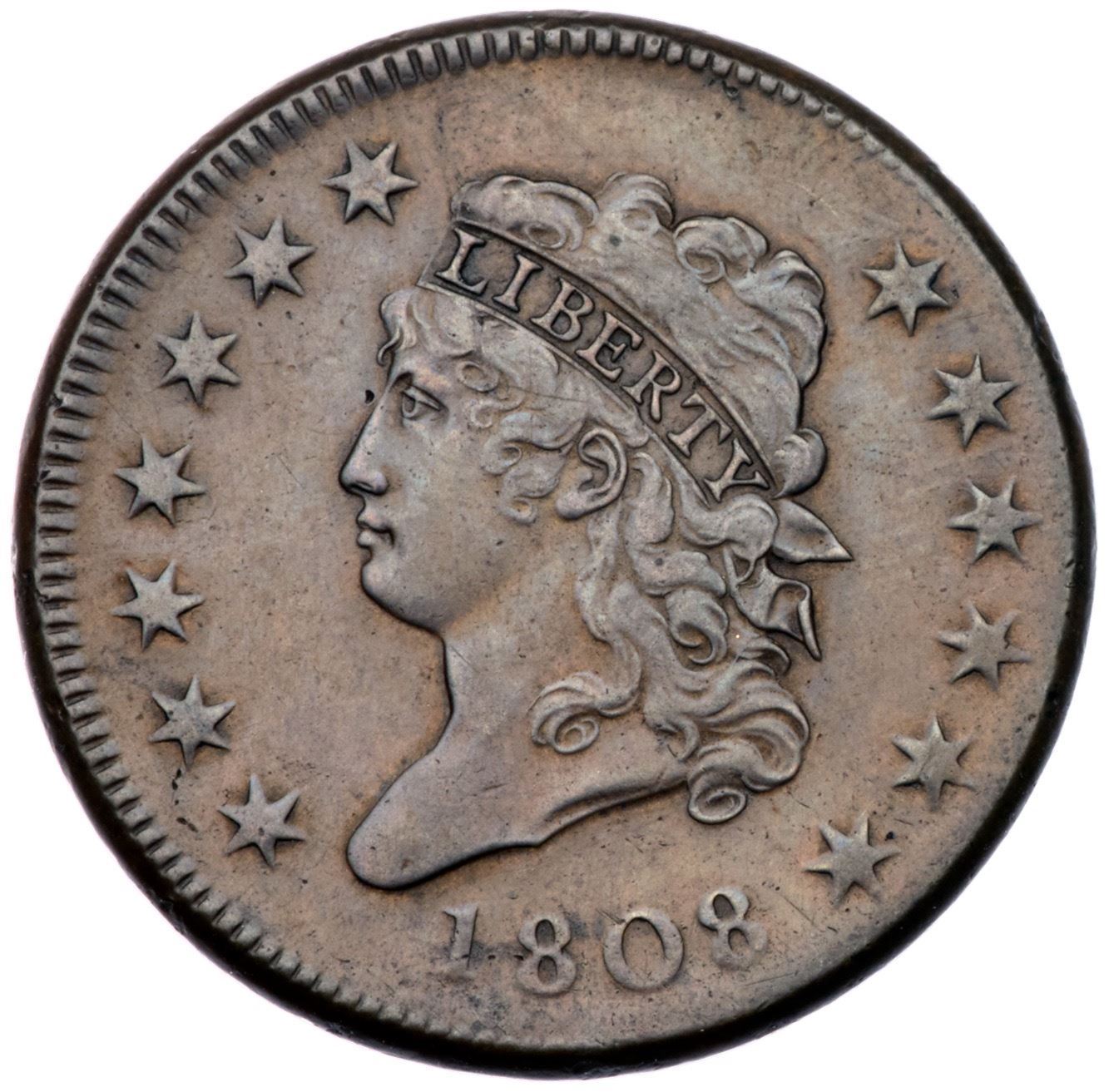 1808 S-278 R3 VF20Glossy medium brown and steel with frosty lighter brown in protected areas on the obverse. The toning is quite attractive and looks original, but the obverse was lightly smoothed and the cent was retoned. No notable marks and the eye appeal is still quite nice for the grade. EDS, Breen state I, with sharp dentils on both sides.Certificate Number: Pedigree: Ex James R. McGuigan 6/1979-Fred H. Borcherdt Collection