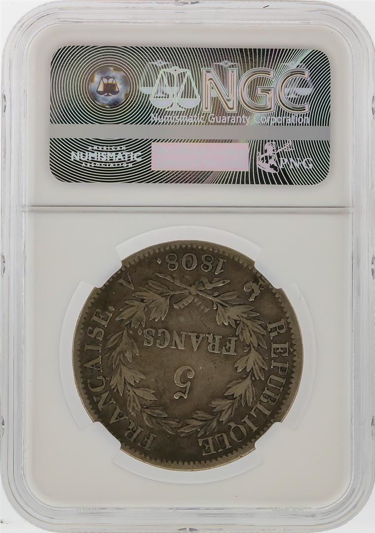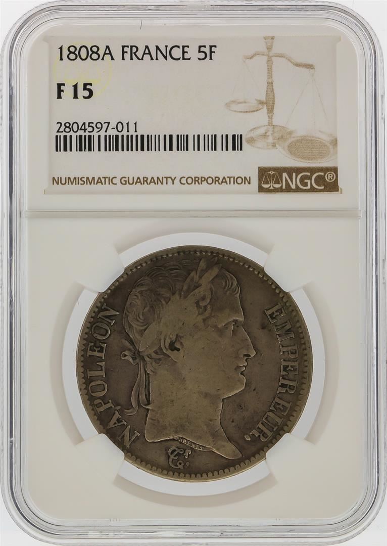 One 1808A 5 Franc Napolean Coin NGC Graded F15. NGC Certified.
