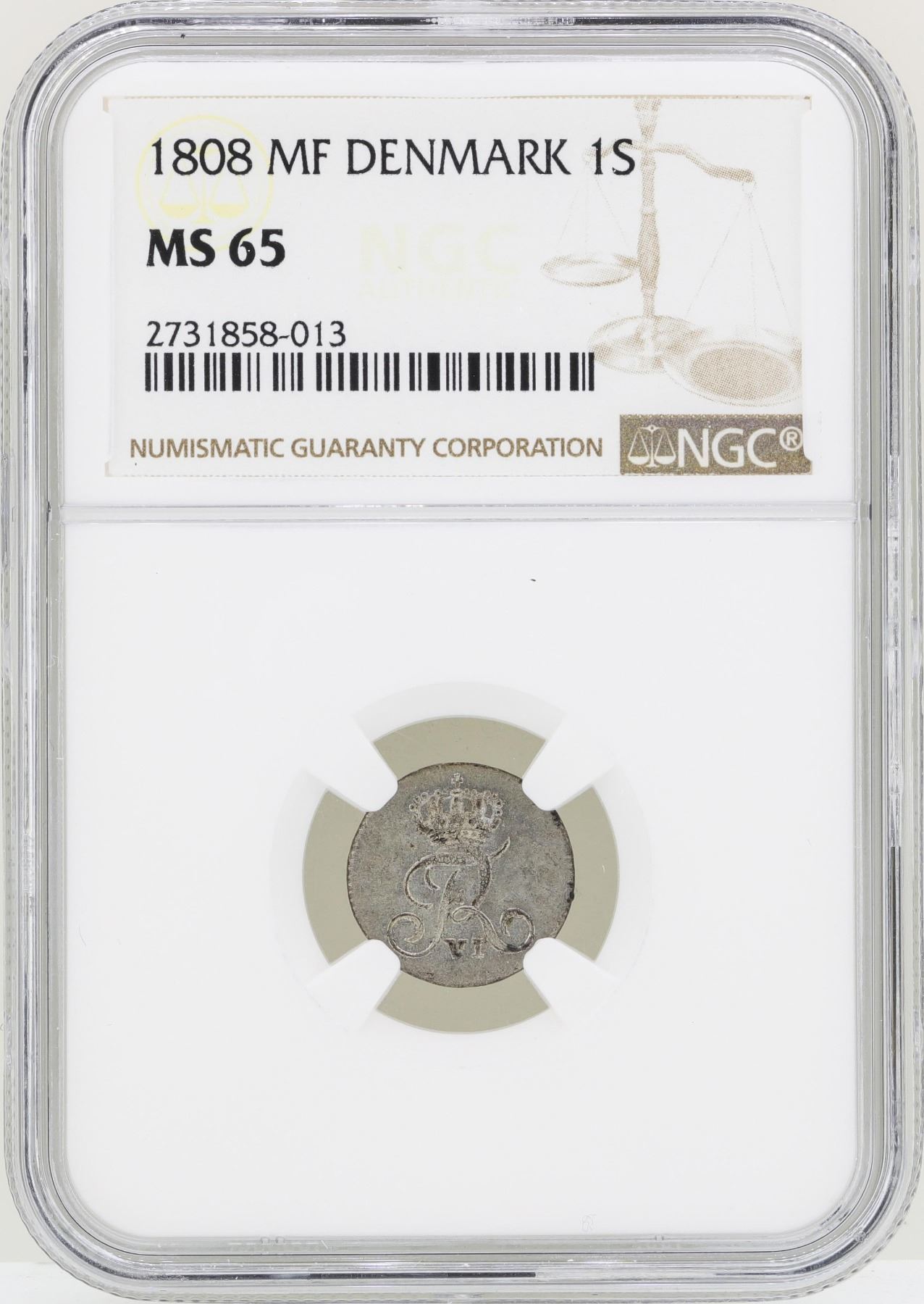 One 1808MF Denmark Skilling Coin NGC MS65.