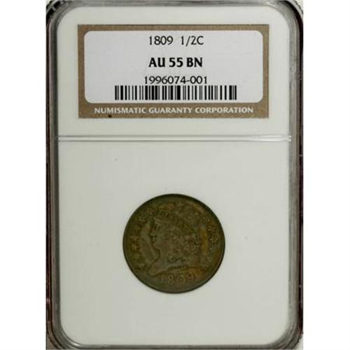 <B>1809 1/2 C AU55 NGC.</B></I> NGC Census: (19/105). PCGS Population (23/60). Mintage: 1,154,572. Numismedia Wsl. Price for NGC/PCGS coin in AU55: $290. (#1123)<BR><BR><B>Coin Engraver:</B> John Reich<BR><BR><b>Shipping:</b> Coins & Currency (<a target="_blank" href="http://www.heritageauctions.com/common/shipping.php">view shipping information</a>)