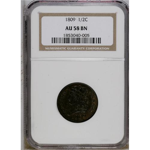 <B>1809 1/2 C AU58 NGC.</B></I> C-6, B-6, R.1. A well-preserved example of this early half cent with just a touch of friction on the devices. Nicely detailed with lightly marked but otherwise untroubled chocolate-brown surfaces. EAC 55.<BR><BR><b>Shipping:</b> Coin/Currency (<a target="_blank" href="http://www.heritageauctions.com/common/shipping.php">view shipping information</a>)