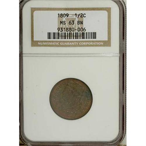 <B>1809 1/2 C MS63 Brown NGC.</B></I> NGC Census: (15/20). PCGS Population (17/9). Mintage: 1,154,572. (#1123)<BR><BR><B>Coin Engraver:</B> John Reich<BR><BR><b>Shipping:</b> Coins & Currency (<a target="_blank" href="http://www.heritageauctions.com/common/shipping.php">view shipping information</a>\)