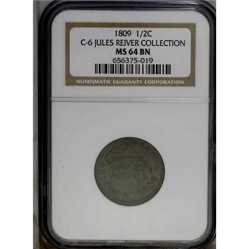 <B>1809<1/2 C> Normal Date. C-6, B-6, R.1. Die State 5. MS64 Brown NGC. MS60 EAC.</B></I> Wide date, 0 low; High leaf midway between S and O. <B>This is the Manley Plate Coin for State 5.</B></I> Less than perfect centering and extremely weak border details on both sides essentially eliminates any observation of the rim breaks from the obverse die. This is one of the two most plentiful varieties of the year, along with Cohen-3, but high grade examples of this variety are still quite elusive. A fully detailed and highly lustrous steel-brown example with splashes of red mint color on the reverse. The reverse is rotated approximately 135 degrees counterclockwise.<BR><I>Ex: L. Bernstein; Stack's (4/1986), lot 42; Jim McGuigan (3/12/1987).</B></I> Envelope Included.