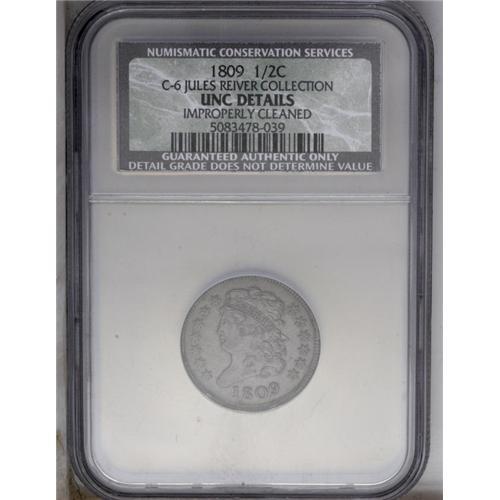<B>1809<1/2 C> Normal Date. C-6, B-6, R.1. Die State 2--Improperly Cleaned--NCS. Unc Details. XF40 EAC.</B></I> Wide date, 0 low; High leaf midway between S and O. The rim break over stars 9 and 10 is clearly visible, but the second rim break of State 3 is not present. Most dentilation remains visible on both sides. Even though this is a common variety, early die states with all or most of the border dentilation still visible, are quite scarce and seldom encountered in the marketplace. Light olive-brown with pale grayish overtones, undoubtedly cleaned and recolored, but quite attractively so. A few minor rim bruises are evident on both sides.<BR><I>Ex: Orfield (11/9/1985).</B></I> Envelope Included.