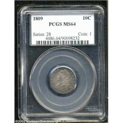 <table><tr><td><TABLE cellSpacing=0 cellPadding=0 width="100%" bgColor=#000000 border=0><TBODY> <TR><TD width="100%"><TABLE cellSpacing=1 cellPadding=3 width="100%" border=0><TBODY><TR><TD width="100%" bgColor=#79735c><FONT face=arial color=#ffffff size=3><B>Description</B> </FONT></TD></TR><TR><TD width="100%" bgColor=#ffffff><FONT face=arial size=2><B>1809 10C MS64 PCGS.</B></I> JR-1, R.4. The only known dies for the year, and also very scarce as a variety. Sea-green, gold, orange, and mauve patina bathes this satiny and well preserved near-Gem. The centers are crisply struck, although the stars are generally flat. This beautifully toned representative would be a highlight of any specialized collection of Capped Bust Dimes. Population: 3 in 64, 4 finer (10/03). </FONT></TD></TR></TBODY></TABLE></TD></TR></TBODY></TABLE><BR><A name=PricesRealized></A><TABLE cellSpacing=0 cellPadding=0 width="100%" bgColor=#000000 border=0><TBODY><TR><TD width="100%"><TABLE cellSpacing=1 cellPadding=3 width="100%" border=0><TBODY><TR><TD width="100%" bgColor=#79735c><A name=PR><FONT face=arial color=#ffffff size=3><B>Previous Prices from Heritage Auctions</B> </FONT></A></TD></TR><TR><TD bgColor=#f6f6ed>No Prior Data Recorded </TD></TR><TR><TD bgColor=#ffffff><FONT face=arial size=1 ?>PLEASE NOTE: All prices realized reflect the final hammer price PLUS the buyer's premium in auctions that charge a buyer's premium. Each item has a notation at the top of the listing indicating whether that lot included a buyer's premium. Example: A item that sells with a final hammer price of $100 and a 20% buyer's premium will display with a price realized of $120. All information listed is intended to be as accurate as possible, but errors are possible. Please use this guide carefully and inform us of any inaccuracies. </FONT></TD></TR></TBODY></TABLE></TD></TR></TBODY></TABLE><BR><TABLE cellSpacing=0 cellPadding=0 width="100%" bgColor=#000000 border=0><TBODY><TR><TD width="100%"><TABLE cellSpacing=1 cellPadding=3 width="100%" border=0><TBODY><TR><TD width="100%" bgColor=#79735c colSpan=6><FONT face=arial color=#ffffff size=3><B>Price Guide*</B> </FONT></TD></TR><TR bgColor=#f6f6ed><TD align=middle><B>Grade</B> </TD><TD align=middle><B>Coin World<BR>(Trends)</B> </TD><TD align=middle><B>Numismedia<BR>Retail</B> </TD><TD align=middle><B>Numismedia<BR>Wholesale</B> </TD><TD align=middle><B>Coin<BR>Universe</B> </TD><TD align=middle><B>Heritage<BR>Value Index</B> </TD></TR><TR bgColor=#ffffff><TD align=middle>63</TD><TD align=right>---</TD><TD align=right>---</TD><TD align=right>$6,900.00</TD><TD align=right>$5,525.00</TD><TD align=right>$3,823.75</TD></TR><TR style="FONT-WEIGHT: bold" bgColor=#cccfdd><TD align=middle>64</TD><TD align=right>---</TD><TD align=right>---</TD><TD align=right>---</TD><TD align=right>$10,400.00</TD><TD align=right>$6,790.00</TD></TR><TR bgColor=#ffffff><TD align=middle>65</TD><TD align=right>---</TD><TD align=right>---</TD><TD align=right>---</TD><TD align=right>$20,500.00</TD><TD align=right>$13,025.00</TD></TR><TR bgColor=#ffffff><TD colSpan=6><FONT size=1>*All information listed is intended to be as accurate as possible, but errors are possible. No item may be returned or refused based on this information which is provided as a service to our customers. You should contact each pricing source directly to determine the accuracy of this information. </FONT></TD></TR></TBODY></TABLE></TD></TR></TBODY></TABLE><BR><TABLE cellSpacing=0 cellPadding=0 width="100%" bgColor=#000000 border=0><TBODY><TR><TD width="100%"><TABLE cellSpacing=1 cellPadding=3 width="100%" border=0><TBODY><TR><TD width="100%" bgColor=#79735c><FONT face=arial color=#ffffff size=3><B>Population Guide</B> </FONT></TD></TR><TR bgColor=#ffffff><TD align=middle><!-- Begin Output of Population Grid--><TABLE cellSpacing=0 cellPadding=0 width="100%" border=0><TBODY><TR><TD vAlign=center><TABLE cellSpacing=0 width="100%" border=1 cellsadding="3"><TBODY><TR><TD vAlign=center><TABLE cellSpacing=0 cellPadding=3 width="100%" border=1><TBODY><TR><TD vAlign=center align=middle bgColor=#f0f1e8 colSpan=2 <CENTER><FONT face=Arial size=2><B>PCGS Pop </B></FONT><CENTER></CENTER></TD><TD vAlign=center align=middle bgColor=#f0f1e8 colSpan=2><CENTER><FONT face=Arial size=2><B>NGC Pop</B></CENTER></FONT></TD></TR><TR><TD vAlign=center><FONT face=Arial size=2>(64)</FONT> </TD><TD vAlign=center align=right><FONT face=Arial size=2>3</FONT> </TD><TD vAlign=center><FONT face=Arial size=2>(64)</FONT> </TD><TD vAlign=center align=right><FONT face=Arial size=2>3</FONT> </TD></TR><TR><TD vAlign=center><FONT face=Arial size=2>(>64)</FONT> </TD><TD vAlign=center align=right><FONT face=Arial size=2>4</FONT> </TD><TD vAlign=center><FONT face=Arial size=2>(>64)</FONT> </TD><TD vAlign=center align=right><FONT face=Arial size=2>2</FONT> </TD></TR></TBODY></TABLE></TD></TR></TBODY></TABLE></TD></TR></TBODY></TABLE><!-- End Output of Population Grid--></TD></TR></TBODY></TABLE></TD></TR></TBODY></TABLE><BR><TABLE cellSpacing=0 cellPadding=0 width="100%" bgColor=#000000 border=0><TBODY><TR> Important notice: Heritage usually auctions material at the rate of 200-250 lots per hour. On some occasions eBay Live bid software or the Internet may not be able to keep up with the pace of the auction. We recommend placing a realistic absentee bid now as insurance to avoid disappointment. Occasionally the auctioneer may eliminate or reject an eBay Live bid, and the auctioneer may also reopen a lot after the close of the eBay live bidding (usually because we missed an audience bid), and may reject your bid even if it shows you as the winning bidder. By bidding via eBay Live, you agree that Heritage may award the lot to another bidder at its sole discretion under the circumstances described above or any other reasonable circumstances. Also please note that all Heritage lots purchased through eBay Live carry a 20% Buyer's Premium. Please make sure you read the Terms and Conditions befo