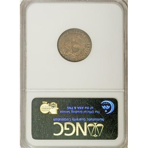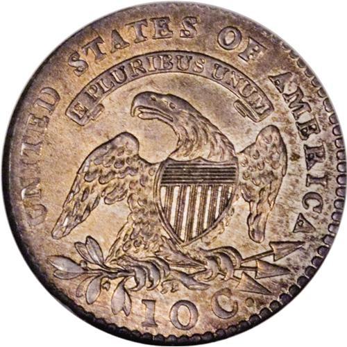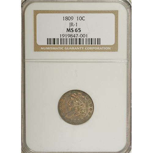 <B>1809 10C MS65 NGC.</B></I> JR-1, R.4. Only one die pairing is known for the 1809 dime, which is expected considering that only 51,065 pieces were struck. This mintage proved to be the lowest of the Capped Bust type, which was introduced in 1809 and in use until 1837. The dime was one of the last denominations to embrace new designs from John Reich, although the Capped Bust half dime had to wait until 1829, long after Reich had left the mint.<BR> Medium golden-orange patina illuminates this satiny and unmarked Gem. The left side stars are soft, but the remainder of the designs are precisely brought up aside from a couple of soft letters in UNITED. A spindly die crack connects Liberty's nose to star 5. This crack merges with a second, vertical crack on the neck to form a small die break on the cheek. Census: 3 in 65, 0 finer (4/07).<BR><BR><b>Shipping:</b> Coins & Currency (<a target="_blank" href="http://www.heritageauctions.com/common/shipping.php">view shipping information</a>)