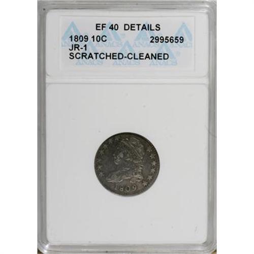 <B>1809 10C --Cleaned, Scratched--ANACS. XF40 Details.</B></I> JR-1. NGC Census: (3/23). PCGS Population (5/18). Mintage: 51,065. Numismedia Wsl. Price for NGC/PCGS coin in XF40: $850. (#4486)<BR><BR><B>Coin Engraver:</B> John Reich<BR><BR><b>Shipping:</b> Coins & Currency (<a target="_blank" href="http://www.heritageauctions.com/common/shipping.php">view shipping information</a>\)