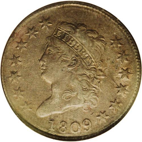 <B>1809<1C> AU58 NGC.</B></I> S-280, the only known dies, R.2. Struck from a later state of the dies, the die crack through star 11 is readily evident, and there is a second crack at the top of the reverse through the E in STATES. Well defined throughout, the surfaces have even brown patina over both sides and there are only two small abrasions on the obverse that bear mentioning: one at the front of Liberty's neck, and the other on her upper lip giving her the appearance of having a moustache. EAC 40. Census: 6 in 58, 6 finer (4/06).