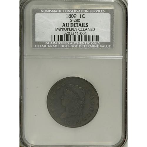 <B>1809 1C --Improperly Cleaned--NCS. AU Details.</B></I> S-280, B-1, R.2. Breen Die State III, with ridge through star 11. This bold but mildly granular mahogany-brown piece was carefully wiped to smooth the surfaces. Nonetheless, a high grade for the conditionally rare date, known from a single die marriage. EAC 20.<BR><BR><b>Shipping:</b> Coins & Currency (<a target="_blank" href="http://www.heritageauctions.com/common/shipping.php">view shipping information</a>)