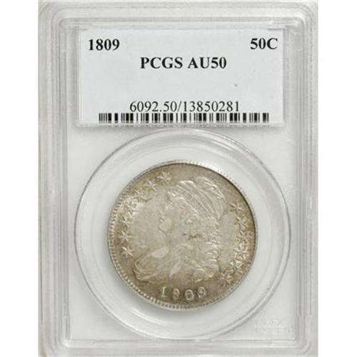 <B>1809 50C AU50 PCGS.</B></I> PCGS Population (39/152). NGC Census: (26/221). Mintage: 1,405,810. Numismedia Wsl. Price for NGC/PCGS coin in AU50: $450. (#6092)<BR><BR><B>Coin Engraver:</B> John Reich<BR><BR><b>Shipping:</b> Coins & Currency (<a target="_blank" href="http://www.heritageauctions.com/common/shipping.php">view shipping information</a>)