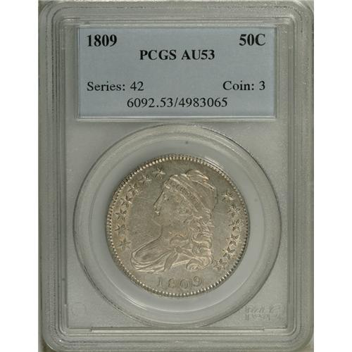 <B>1809 50C AU53 PCGS.</B></I> O-104, Low R.5. Although now considered to be a low R.5 variety, it still qualifies at that rarity level, seemingly a magical rating that means higher prices due to supply and demand, although today, as more collectors start collections of these coins, Capped Bust half dollars at the R.4 level are also in demand. Light silver-gray surfaces are enhanced by pale gold toning across both sides. Although traces of wear can be seen on the high points of the design, this example has nearly full frosty luster. A few faint hairlines and other tiny abrasions are of little consequence, seemingly consistent with the grade assigned by PCGS.<BR><I>Ex: Gerald Schertz Collection.</B></I><BR><I>From The Westmoreland, Virginia Collection, Part Two.</B></I><BR><BR><b>Shipping:</b> Coin/Currency (<a target="_blank" href="http://www.heritageauctions.com/common/shipping.php">view shipping information</a>)
