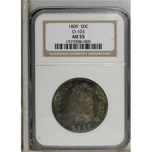<B>1809 50C AU55 NGC.</B></I> O-103, R.1. Deep golden-brown, cobalt-blue, and forest-green envelop this partly lustrous representative. Evaluation beneath a loupe and a strong light locates the occasional moderate mark.<BR><BR><b>Shipping:</b> Coins & Currency (<a target="_blank" href="http://www.heritageauctions.com/common/shipping.php">view shipping information</a>)