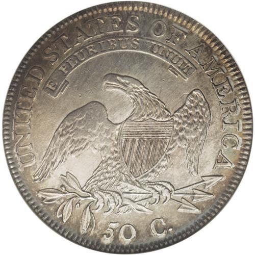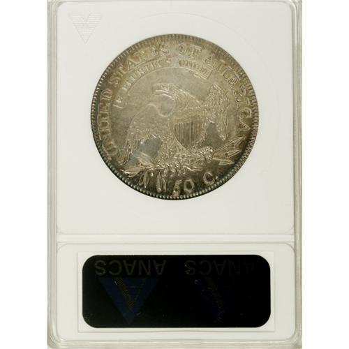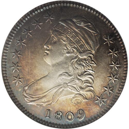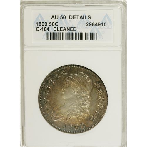 <B>1809 50C --Cleaned--ANACS. AU50 Details.</B></I> O-104, Low R.5. An important Bust half dollar variety attributed by a scalloped point toward curl on star 13, a die line close to star 5 near the inner point, and a vertical die line just inside shield border at the left side of the lower crossbars. Silver-colored surfaces on the obverse are framed by cobalt-blue, lavender, and golden brown toning around the borders, while the reverse is mostly silver-gray with lightly toned borders. The design elements exhibit excellent detail, except for the usual weakness in the eagle's upper right (left facing) wing. Magnification reveals fine hairlines, otherwise both faces are devoid of mentionable marks. The Bust half aficionado will not be displeased, the light cleaning notwithstanding.<BR><BR><b>Shipping:</b> Coins & Currency (<a target="_blank" href="http://www.heritageauctions.com/common/shipping.php">view shipping information</a>)