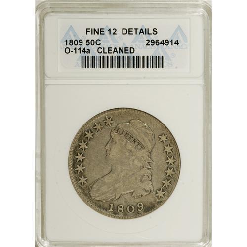 <B>1809 50C --Cleaned--ANACS. Fine 12 Details.</B></I> O-114a. NGC Census: (5/446). PCGS Population (6/321). Mintage: 1,405,810. Numismedia Wsl. Price for NGC/PCGS coin in F12: $53. (#6092)<BR><BR><b>Shipping:</b> Coins & Currency (<a target="_blank" href="http://www.heritageauctions.com/common/shipping.php">view shipping information</a>)