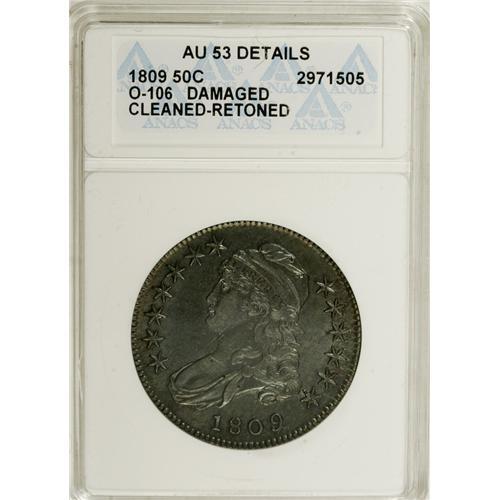<B>1809 50C --Cleaned, Damaged, Retoned--ANACS. AU53 Details.</B></I> O-106. NGC Census: (44/386). PCGS Population (21/125). Mintage: 1,405,810. Numismedia Wsl. Price for NGC/PCGS coin in AU53: $500. (#6092)<BR><BR><b>Shipping:</b> Coins & Currency (<a target="_blank" href="http://www.heritageauctions.com/common/shipping.php">view shipping information</a>)