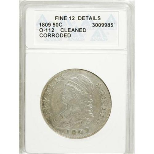 <B>1809 50C --Cleaned, Corroded--ANACS. Fine 12 Details.</B></I> O-112. NGC Census: (4/374). PCGS Population (6/351). Mintage: 1,405,810. Numismedia Wsl. Price for NGC/PCGS coin in F12: $82. (#6092)<BR><BR><B>Coin Engraver:</B> John Reich<BR><BR><b>Shipping:</b> Coins & Currency (<a target="_blank" href="http://www.heritageauctions.com/common/shipping.php">view shipping information</a>)