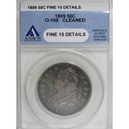<B>1809 50C --Cleaned--ANACS. Fine 15 Details.</B></I> O-108. NGC Census: (1/364). PCGS Population (12/338). Mintage: 1,405,810. Numismedia Wsl. Price for NGC/PCGS coin in F15: $95. (#6092)<BR><BR><B>Coin Engraver:</B> John Reich<BR><BR><b>Shipping:</b> Coins & Currency (<a target="_blank" href="http://www.heritageauctions.com/common/shipping.php">view shipping information</a>)