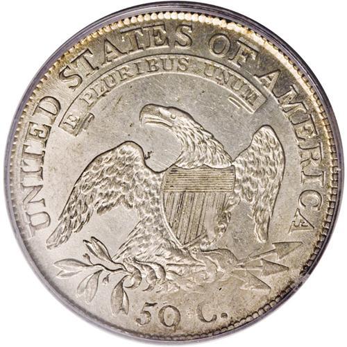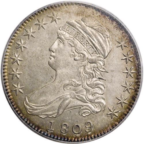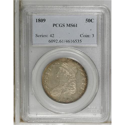 <B>1809 50C MS61 PCGS.</B></I> O-107, R.3. Fine straight lines radiate from the eagle's neck and left wing, and a rough area through the denomination appears, both characteristic of this die pairing. On the obverse the 18 is much wider than the 809. The luster is a tad diminished by the light gray toning, not overly so, and some miscellaneous, scattered undistracting marks contribute to the grade. The rims show deep amber-gold toning, and the entire effect is appealing.<BR><BR><b>Shipping:</b> Coins & Currency (<a target="_blank" href="http://www.heritageauctions.com/common/shipping.php">view shipping information</a>)