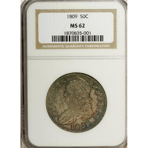 <B>1809 50C MS62 NGC.</B></I> O-102, R.1. Ocean-blue, ruby-red, and gunmetal-gray envelop this satiny early Capped Bust half. The eagle's left (facing) wing is softly defined near the shield, and a trio of light marks are noted on the cheek. Census: 19 in 62, 37 finer (12/06).<BR><BR><b>Shipping:</b> Coin/Currency (<a target="_blank" href="http://www.heritageauctions.com/common/shipping.php">view shipping information</a>)