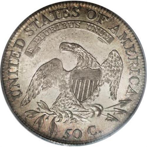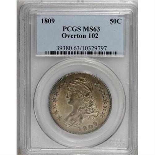<B>1809 50C MS63 PCGS.</B></I> O-102, R.1. Very close to O-102a, but the die crack above UNITED STATES fails to extend to AMERICA. This impressive representative has lovely olive-green and rose-red toning. Satin luster crosses the open fields, and the surfaces lack all but the most inconsequential contact.<BR><BR><B>Coin Engraver:</B> John Reich<BR><BR><b>Shipping:</b> Coins & Currency (<a target="_blank" href="http://www.heritageauctions.com/common/shipping.php">view shipping information</a>)