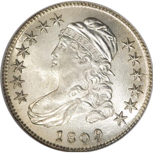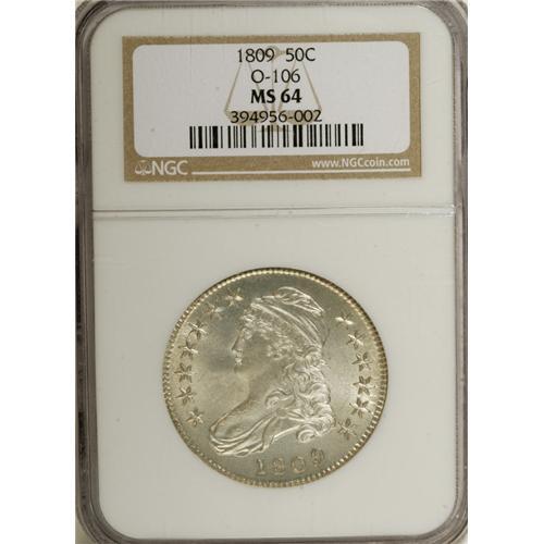 <B>1809 50C MS64 NGC.</B></I> O-106, R.3. A die crack connects the left side stars, while the N in UNITED has a recut left foot. Both sides impart a bright, lustrous appearance with only the slightest hint of pale golden color near the borders. Sharply defined throughout, several chatter marks are seen across the eagles left wing that limit the grade. The present piece is almost certainly among the six finest of this scarce variety. Census: 15 in 64, 8 finer (12/06).<BR><I>Ex: Goldberg Coins (9/2005), lot 1710.</B></I><BR><I>From The Rocky Top Collection of Bust Half Dollars.</B></I><BR><BR><b>Shipping:</b> Coin/Currency (<a target="_blank" href="http://www.heritageauctions.com/common/shipping.php">view shipping information</a>)