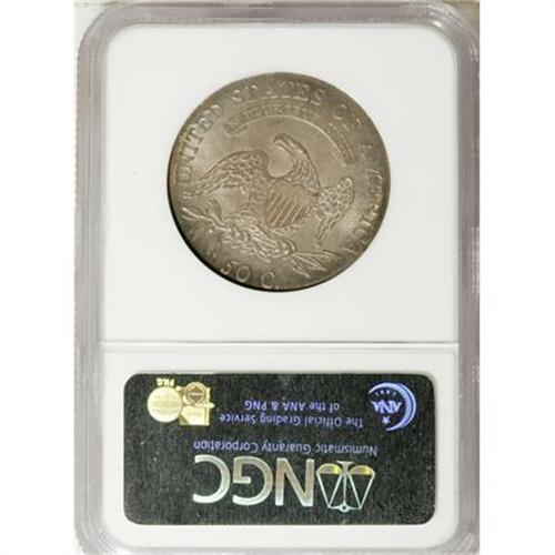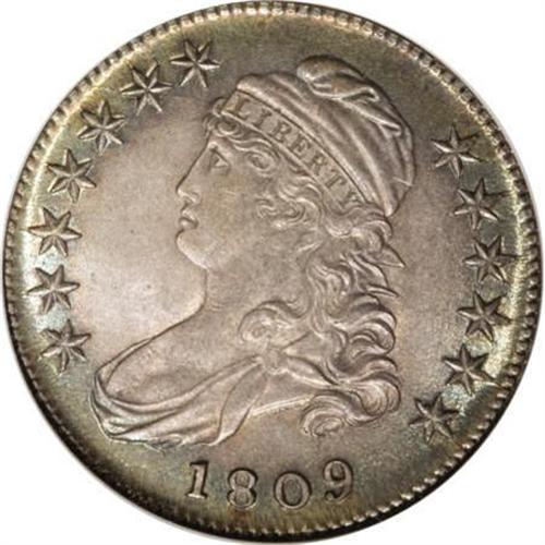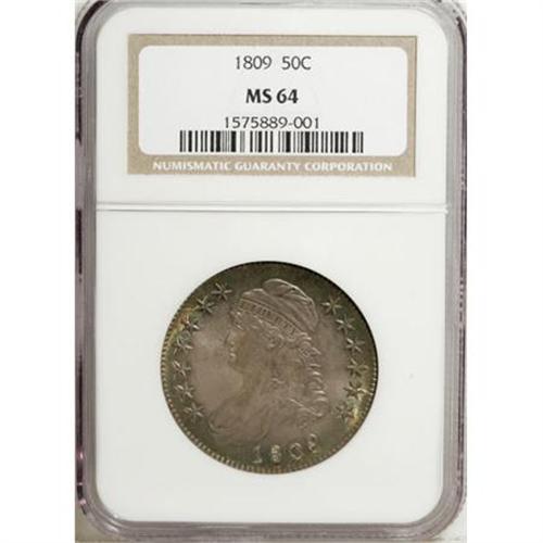 <B>1809 50C MS64 NGC.</B></I> O-115, R.2. A protrusion from the fifth set of vertical lines in the fields is diagnostic. Both sides of this strongly lustrous half display rich plum patina, and the obverse has thin crescents of green-gold at the upper and lower rims as well. A great example, solidly struck overall with excellent visual appeal. Census: 19 in 64, 8 finer (7/07).<BR><BR><B>Coin Engraver:</B> John Reich<BR><BR><b>Shipping:</b> Coins & Currency (<a target="_blank" href="http://www.heritageauctions.com/common/shipping.php">view shipping information</a>\)