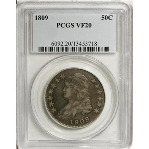 <B>1809 50C VF20 PCGS.</B></I> O-112, R.5. Dots between the ES of STATES and below the M of AMERICA identify this rare Overton variety. This moderately worn piece, toned in various grays, shows few marks or other distractions.<BR><BR><B>Coin Engraver:</B> John Reich<BR><BR><b>Shipping:</b> Coins & Currency (<a target="_blank" href="http://www.heritageauctions.com/common/shipping.php">view shipping information</a>)
