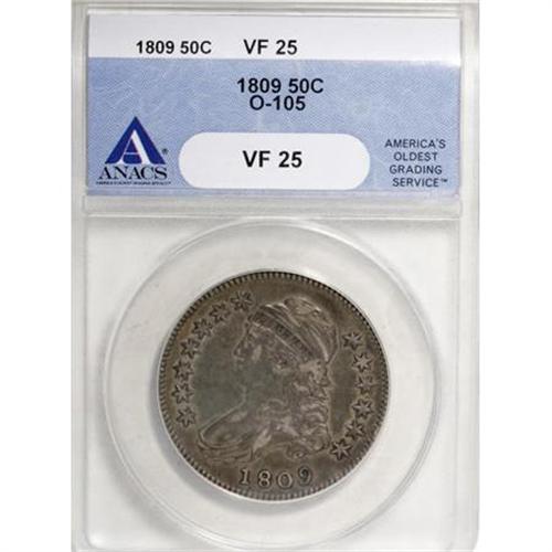 <B>1809 50C VF25 ANACS.</B></I> O-105.<B> </B></I>NGC Census: (10/359). PCGS Population (12/319). Mintage: 1,405,810. Numismedia Wsl. Price for NGC/PCGS coin in VF25: $138. (#6092)<BR><BR><B>Coin Engraver:</B> John Reich<BR><BR><b>Shipping:</b> Coins & Currency (<a target="_blank" href="http://www.heritageauctions.com/common/shipping.php">view shipping information</a>)