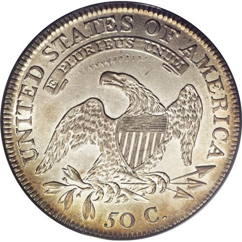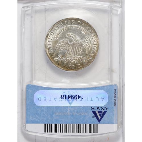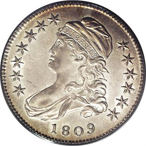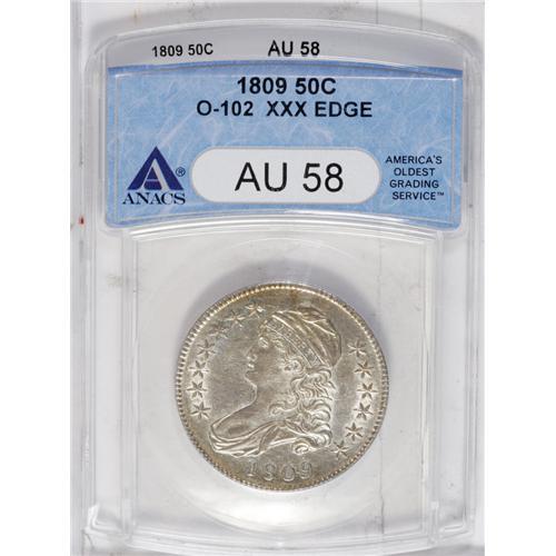 <B>1809<50C> XXX Edge AU58 ANACS.</B></I> O-102, R.1. An attractive example with almost all of the original mint luster still visible. Intermingled rose-gold toning in the central areas deepens to antique-gold at the reverse border. A row of dentil-shaped clash marks above the eagle's head makes the reverse of O-102 immediately recognizable. Another useful diagnostic is that the U in UNITED is boldly doubled.