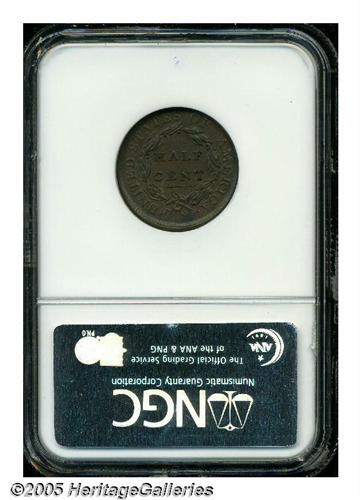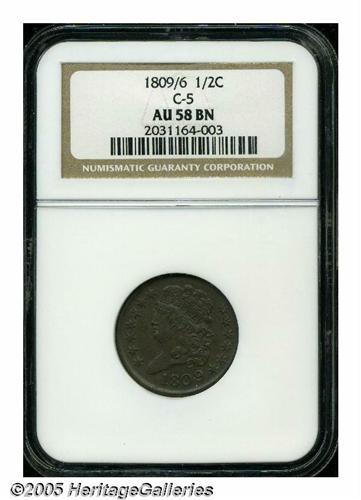 <B>1809/6<1/2 C> AU58 NGC.</B></I> B-5, C-5, R.1. A crisply struck deep chestnut-brown Half Cent that has a few moderate handling marks on the central reverse. A faint spot at 6 o'clock on the reverse is of no importance.