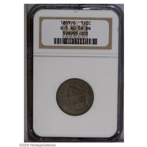 <B>1809/6<1/2 C> AU58 NGC.</B></I> B-5, C-5, R.1. Medium to deep brown in color, with smooth surfaces and ample glimpses of mint luster. Well struck on the major devices, with some softness noted on the peripheral elements. Not exactly an overdate, the 6 in the date was likely initially entered inverted. Population: 25 in 58, 26 finer (9/05).