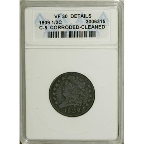 <B>1809/6 1/2 C --Cleaned, Corroded--ANACS. VF30 Details.</B></I> C-5. NGC Census: (2/117). PCGS Population (3/99). Mintage: 1,154,572. Numismedia Wsl. Price for NGC/PCGS coin in VF30: $117. (#1126)<BR><BR><B>Coin Engraver:</B> John Reich<BR><BR><b>Shipping:</b> Coins & Currency (<a target="_blank" href="http://www.heritageauctions.com/common/shipping.php">view shipping information</a>)