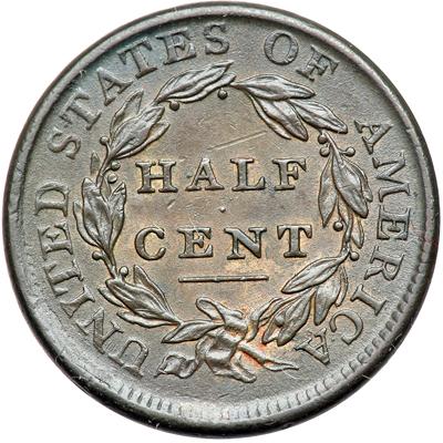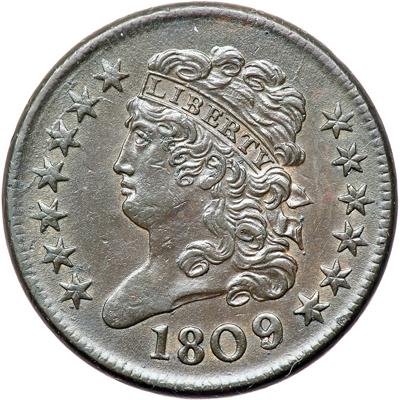 1809/6 C-5 R1. EF-45 Plus. Overdate 9 over 6. Choice glossy chocolate brown with frosty lighter steel brown in protected areas and generous traces of very faded mint red remaining on the reverse. Virtually flawless, very close to AU50. The only mark of any significance is a dull, light scratch above the L in HALF. MDS, Manley state 2.0. The overdate feature (which may be a 9 over inverted 9) is obvious.