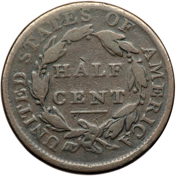 1809/6 C-5 R1 Overdate 9 over 6 or Inverted 9 G5. Glossy chocolate and steel brown. No notable defects and a very ordinary piece except for the unique terminal die state. There are cud breaks extending into the fields at the bust tip and under the 80 in the date, and no evidence of damage or planchet flaws can be found to dispute these are real cuds. A prior examination by Manley and Grellman determined the die state was not late and in fact was rather early, but subsequent study and careful comparison with other examples in various die states shows this piece is, indeed, from the latest state of the dies. This analysis was complicated by the low grade of the piece, but the smooth, corrosion-free surfaces made the analysis possible. The die crack from star 3 to the dentils is wide and strong compared to the earlier die states. This piece is plated in both editions of the Cohen book and in the Manley book on half cent die states (page 211). No other examples have been reported showing either of the cud breaks. The undertype 6 or inverted 9 is still visible under the normal 9, but it is weak. Weight 72.6 grains. Davy #09.5.19.