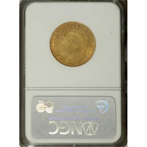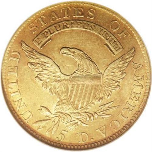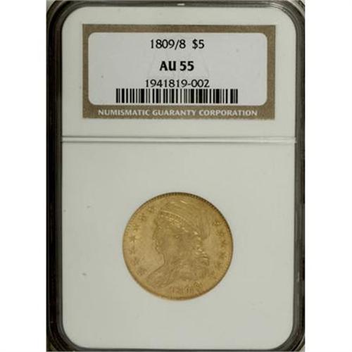 <B>1809/8 $5 AU55 NGC.</B></I> Breen-6458, BD-1, High R.3, the only known dies. This lovely representative has an orange-gold reverse and lighter obverse olive-gold toning. Well struck with minimal wear and only a few minor peripheral marks. The reverse field is clashed above the eagle's wings.<BR><BR><B>Coin Engraver:</B> John Reich<BR><BR><b>Shipping:</b> Coins & Currency (<a target="_blank" href="http://www.heritageauctions.com/common/shipping.php">view shipping information</a>\)