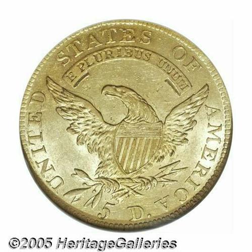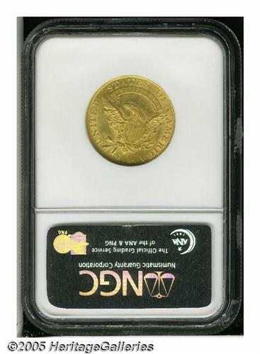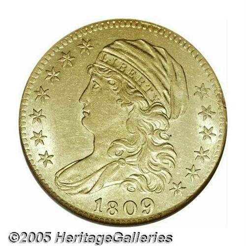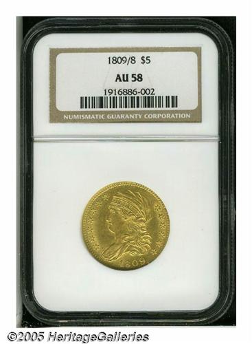 <B>1809/8<$5> AU58 NGC.</B></I> B. 1-A, Miller-108, R.3. Only a single die variety of 1809 Half Eagles are recorded, all of which have traces of an underdigit 8 within the lower loop of the 9 in the date. Star 13 has a scalloped point toward the border, and this is considered the "signature" of artist and engraver John Reich, who prepared this design. This overdate variety does double duty for date and type collectors, as well as variety collectors and specialty collectors. It is the only variety of the year, and ranks among the most common issues of this design. Only the slightest trace of wear is visible on the highest points of this lovely Half Eagle, with virtually complete luster. The light yellow-gold surfaces have only a few minor blemishes.<BR><I>From the Dr. Kurt Peters Collection.</B></I> From the Dr. Kurt Peters Collection.