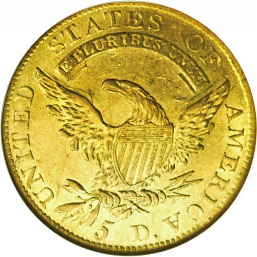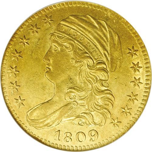 <B>1809/8<$5> AU58 NGC.</B></I> Breen-6458, B. 1-A, Miller-108, R.3. This is the only die variety of the year, thus all 1809 half eagles are overdates. Further, it is one of the most plentiful of all half eagle varieties of this design type. The surfaces are lightly abraded with just a trace of wear on the highest points. It is a fully lustrous and attractive greenish-gold example with hints of orange color.<BR><I>From The Steve Glenn Collection.</B></I> <BR><BR><B>Important notice:</B> Heritage usually auctions material at the rate of 200-250 lots per hour. On some occasions eBay Live bid software or the Internet may not be able to keep up with the pace of the auction. We recommend placing a realistic absentee bid now as insurance to avoid disappointment. Occasionally the auctioneer may eliminate or reject an eBay Live bid, and the auctioneer may also reopen a lot after the close of the eBay live bidding (usually because we missed an audience bid), and may reject your bid even if it shows you as the winning bidder. By bidding via eBay Live, you agree that Heritage may award the lot to another bidder at its sole discretion under the circumstances described above or any other reasonable circumstances. Since eBay bids are not shown to us until we open the lot on the floor, we treat those bids just like floor bids. In most cases the floor responds before the eBay bid is presented to us, due to Internet lag time, so for consistency we have made it a policy that floor bids are always considered first over tie eBay live bids. Also please note that all Heritage lots purchased through eBay Live carry a 20% Buyer's Premium. Please make sure you read the Terms and Conditions before you bid. This lot is being auctioned in conjunction with a live floor auction by Heritage Galleries & Auctioneers. All final auction and invoice information will be supplied by Heritage Galleries & Auctioneers, and all other information should be considered preliminary. Lot:2624 <BR><BR><B>Winning Notification and Billing:</B> After the FINAL session in this auction is complete, Heritage will send e-mail and snail mail invoices. This process normally takes several days. All final auction and invoice information will be supplied by Heritage Galleries & Auctioneers, and all other information should be considered preliminary. <BR><BR>This auction will be conducted on a live auction floor and over the Internet through eBay Live. If you choose to place an absentee bid, please take a moment to <font color='#0000ff'><u><a href='http://pages.ebay.com/liveauctions/help/before/laabsentee.html'>learn how eBay Live absentee bidding works</a></u></font><font color='#000000'>