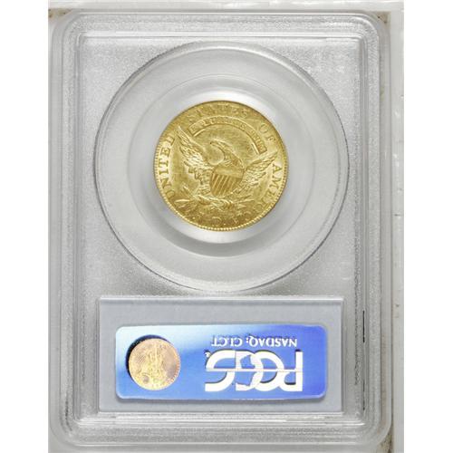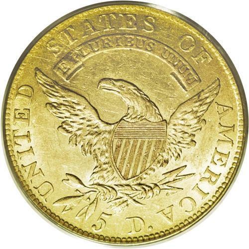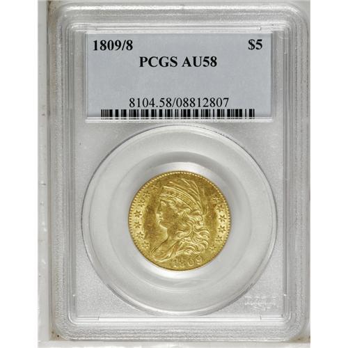 <B>1809/8<$5> AU58 PCGS.</B></I> B. 1-A, Miller-108, R.3. Only one variety is known of this issue, all overdates. Much of the original mint luster remains, and the surfaces exude a warm golden-olive caste with scattered splashes of reddish patina. Sharply struck throughout, the only mentionable flaws are faint, wispy hairlines in the fields and a few tiny contact marks. Minor adjustment marks are also noted near the upper reverse periphery. <BR><BR><B>Important